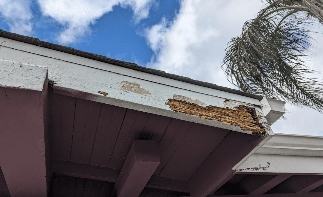 Soft edges, peeling paint, and hidden decay at rooflines—especially near gutters and returns